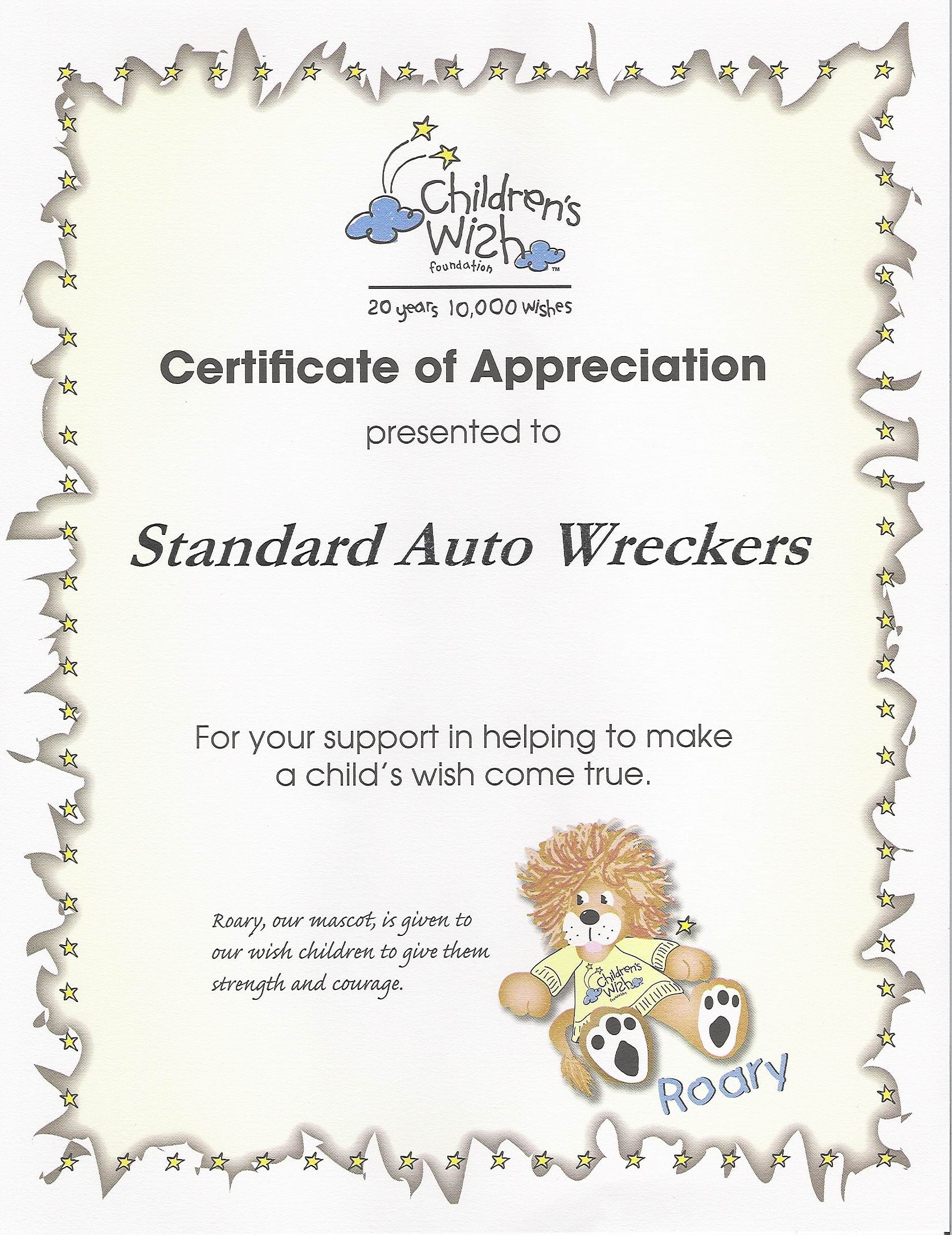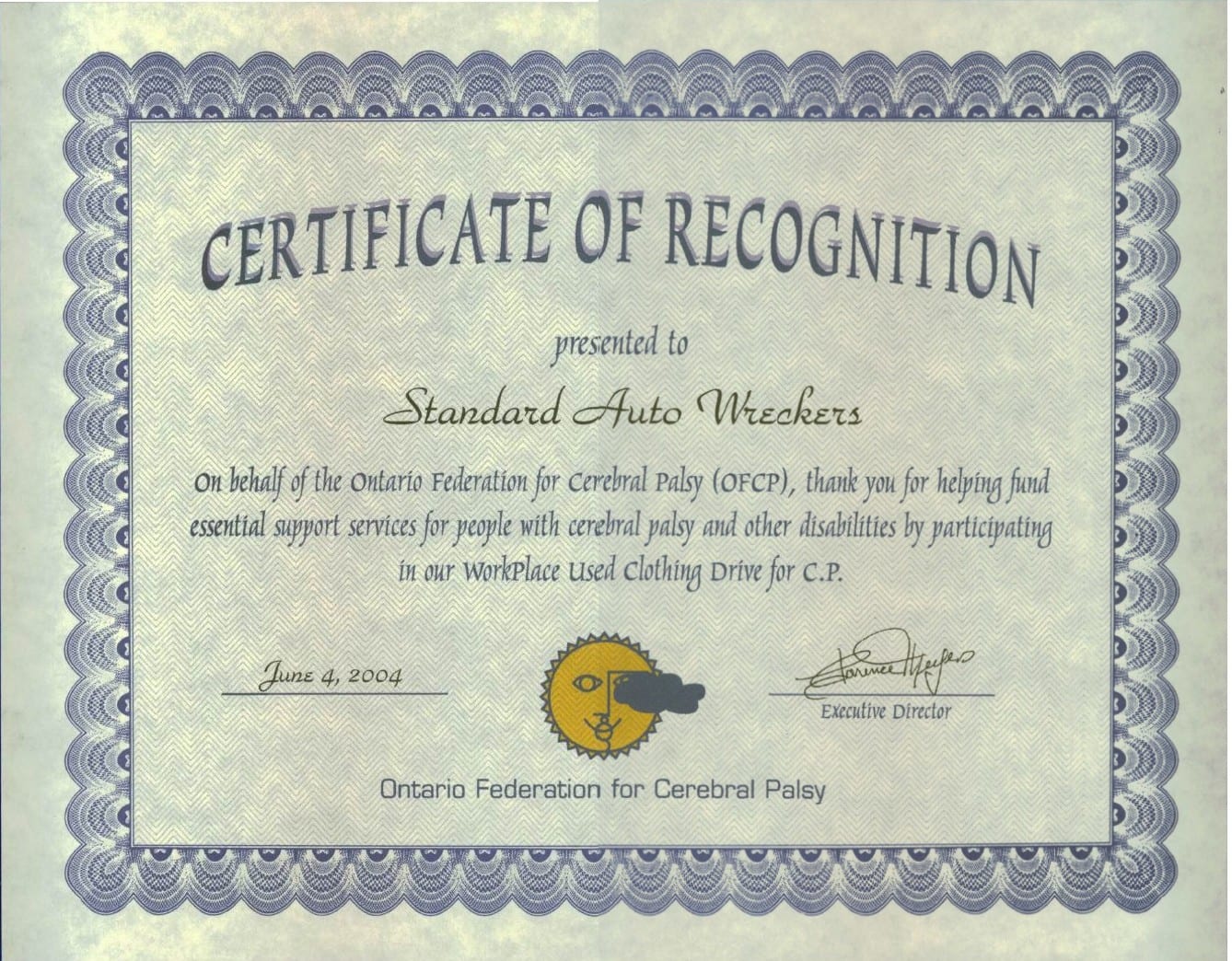 comcerebral_palsy_small Standard Auto Wreckers in the Community – Here at Standard Auto Wreckers we are active in our community. In 2004 our employees donated a whopping 187 bags of clothing for The Ontario Federation Cerebral Palsy. Click on this thumbnail to see the certificate given to us for 2004.