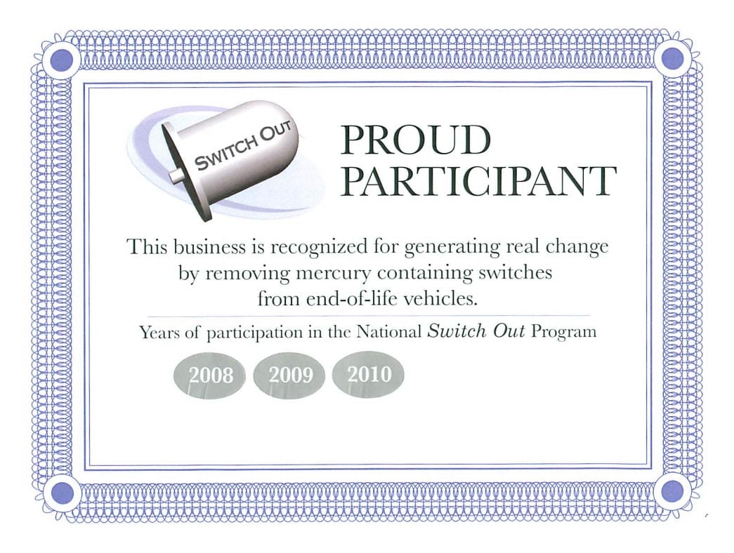 Clean Air Foundation SwitchOut Program – Standard has been participating in the Switch Out program since 2003 and has safely recovered over seven kilograms of mercury! In the most recent mercury switch collection sweep in Ontario, Standard Auto Wreckers collected and returned over 3,700 mercury switches – the most switches returned out of all participating auto recyclers in Ontario!